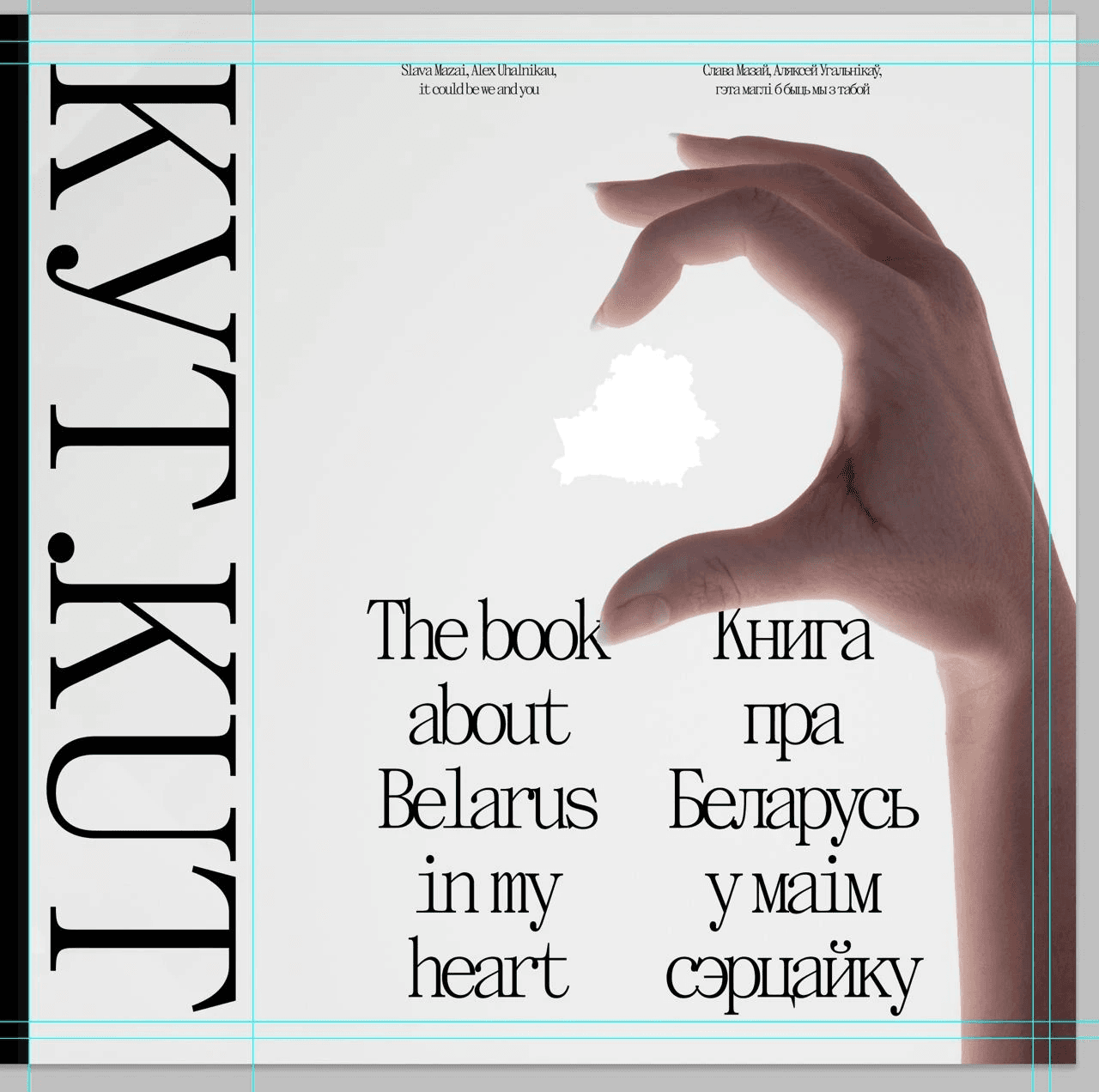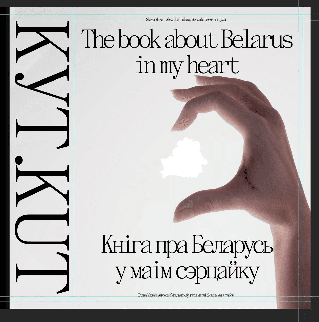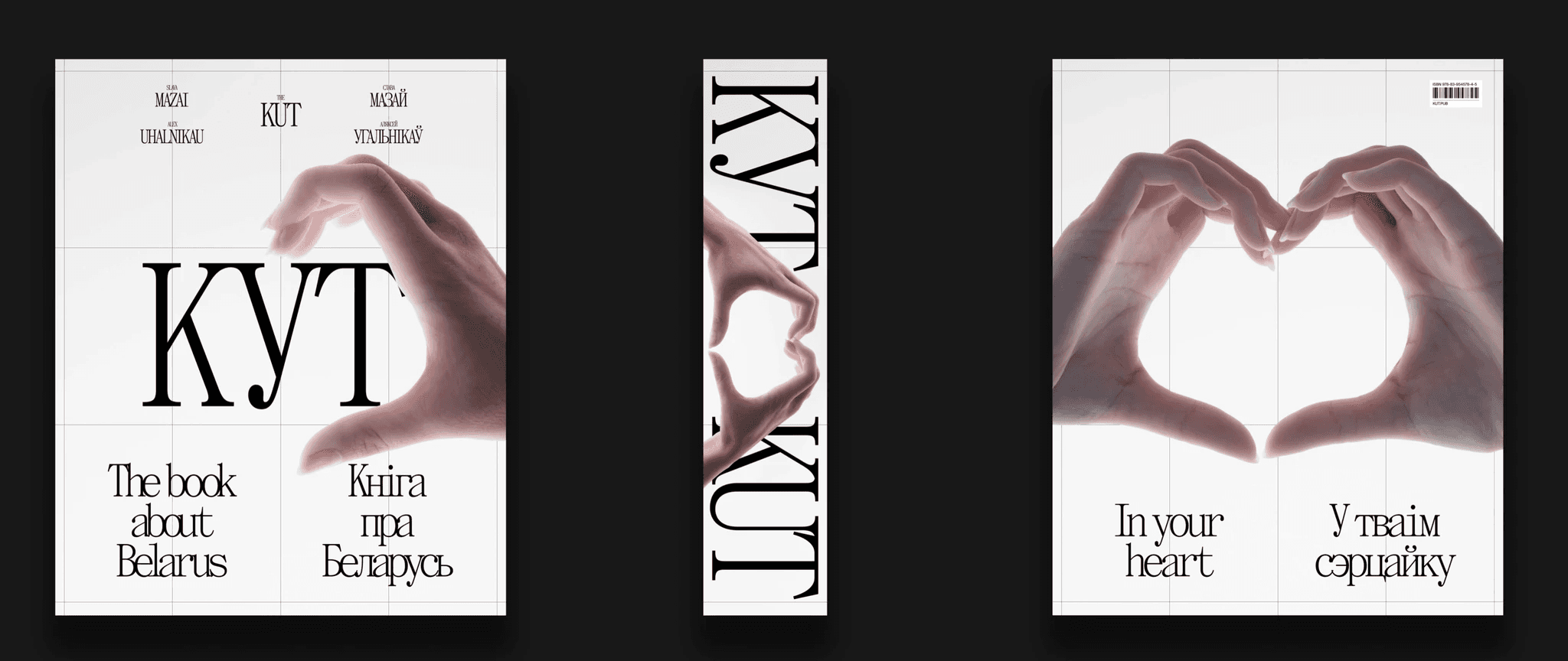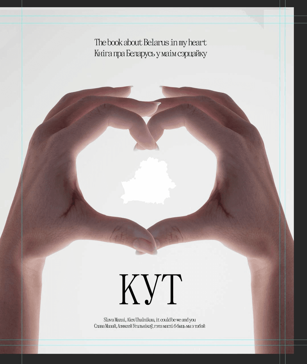 Here's a cover that almost made it to the final cut: making half a hand heart on the cover. The idea was that any person holding the book could put his other hand and get a whole heart. In the heart there would be an outline of Belarus and the inscription "KUT", so that you get "KUT in your heart".