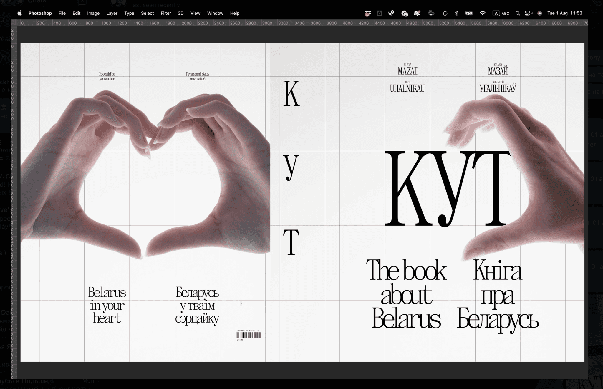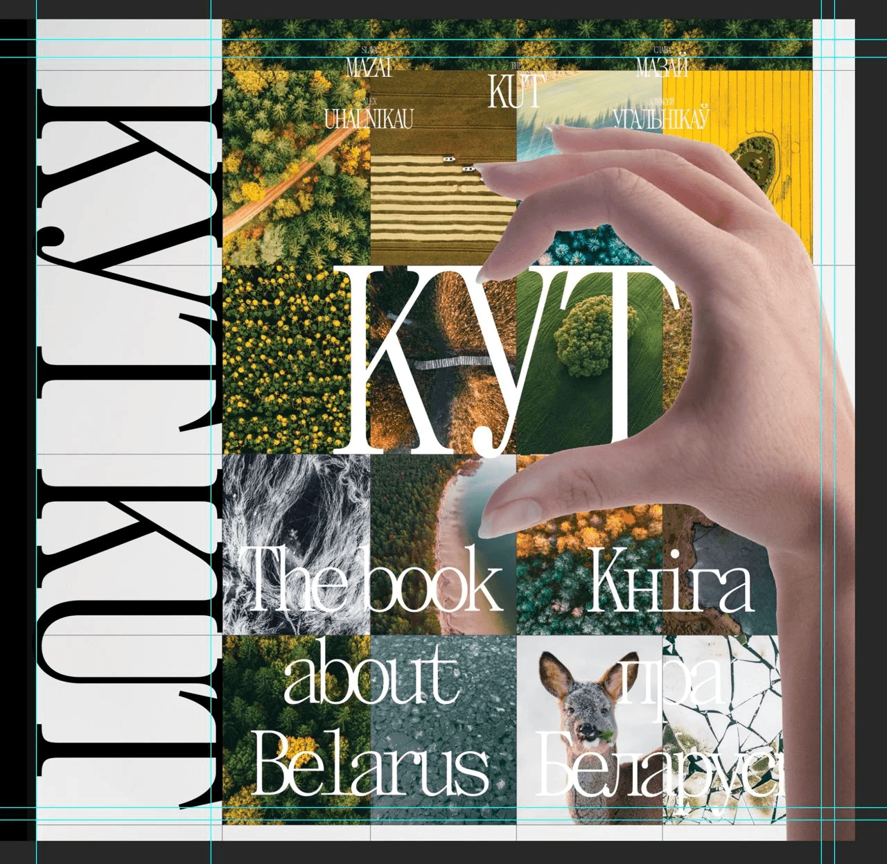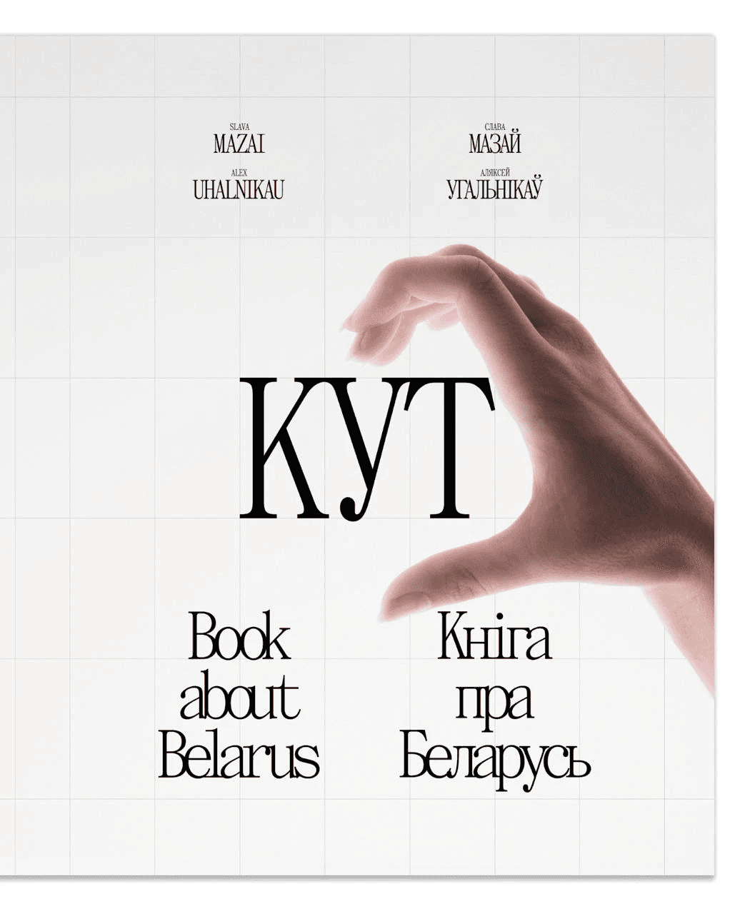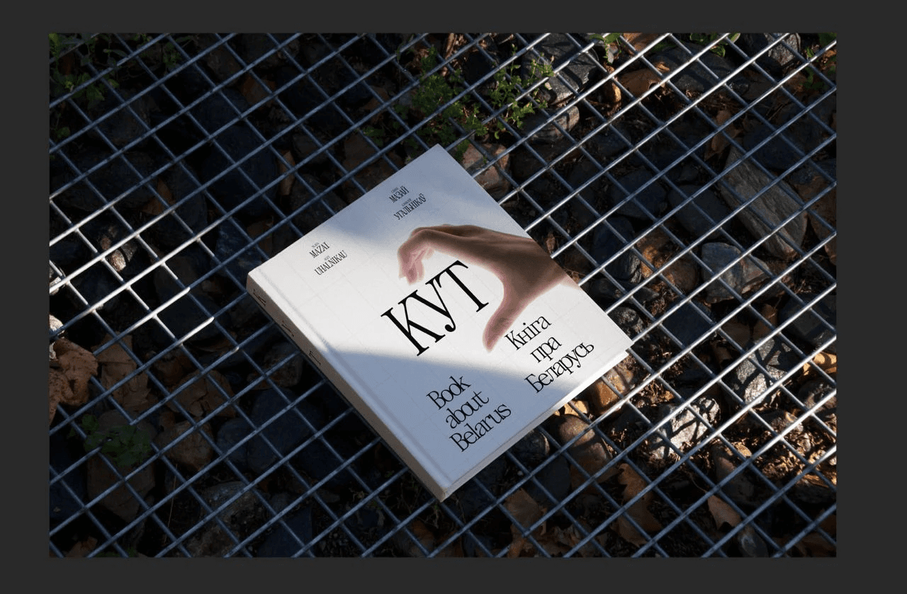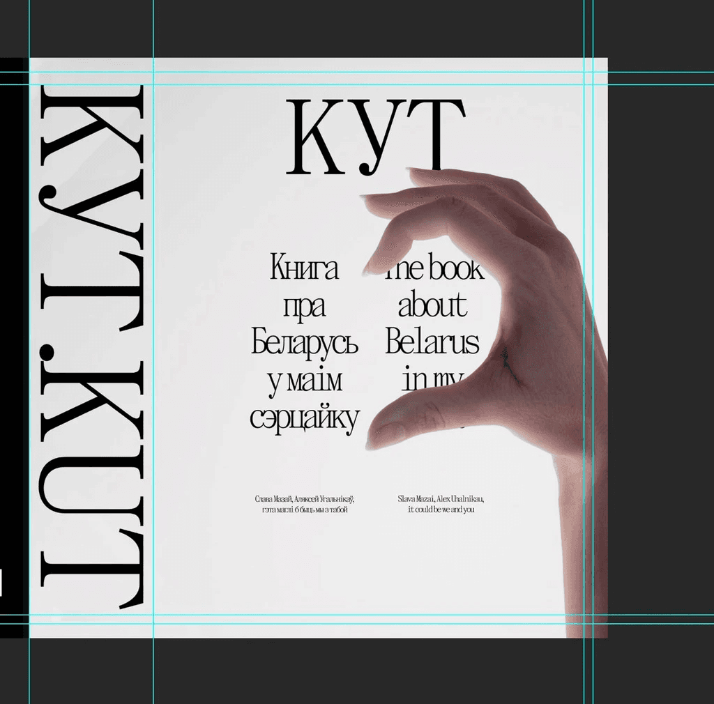 Here's a cover that almost made it to the final cut: making half a hand heart on the cover. The idea was that any person holding the book could put his other hand and get a whole heart. In the heart there would be an outline of Belarus and the inscription "KUT", so that you get "KUT in your heart".