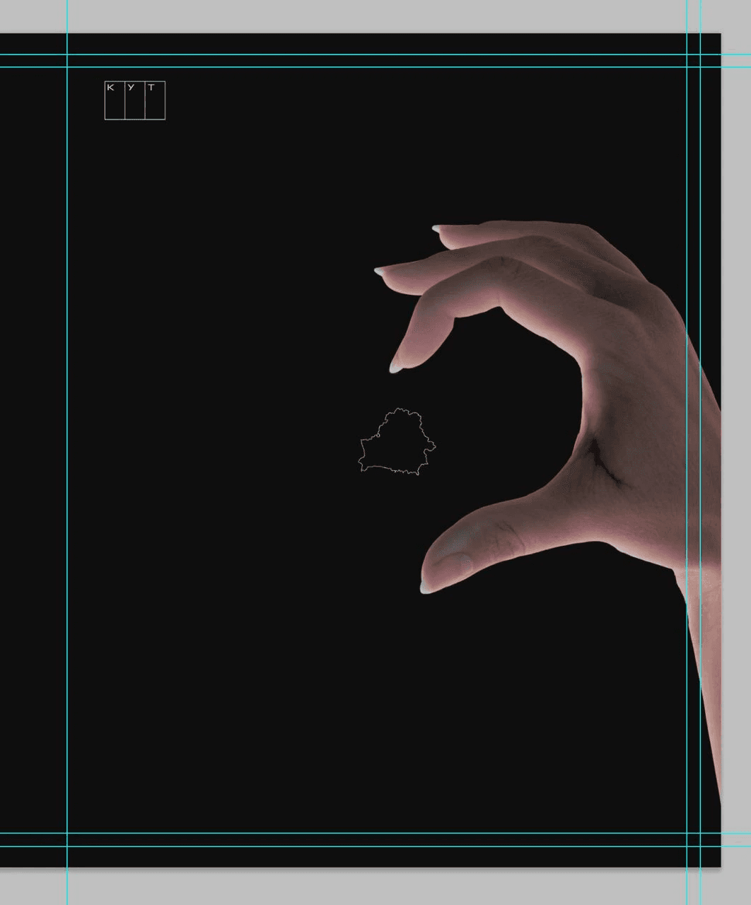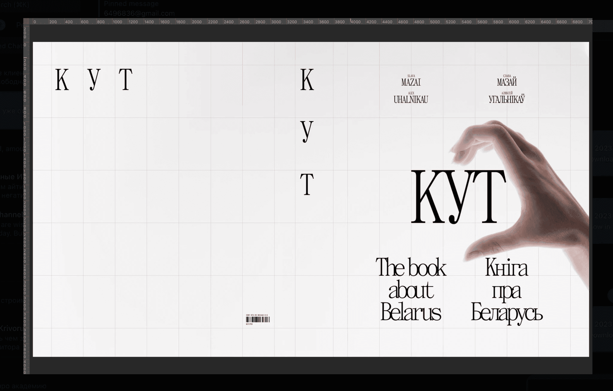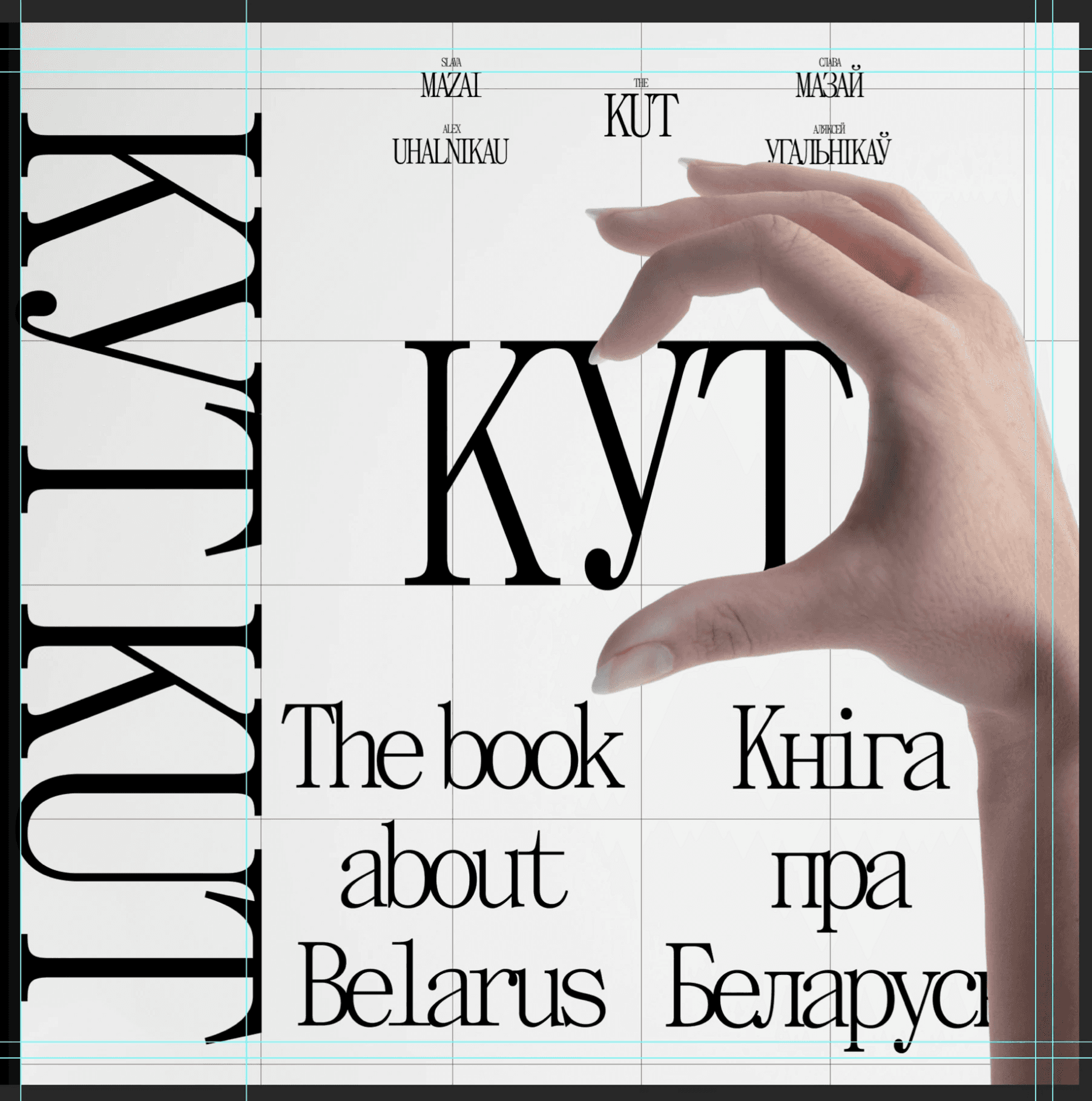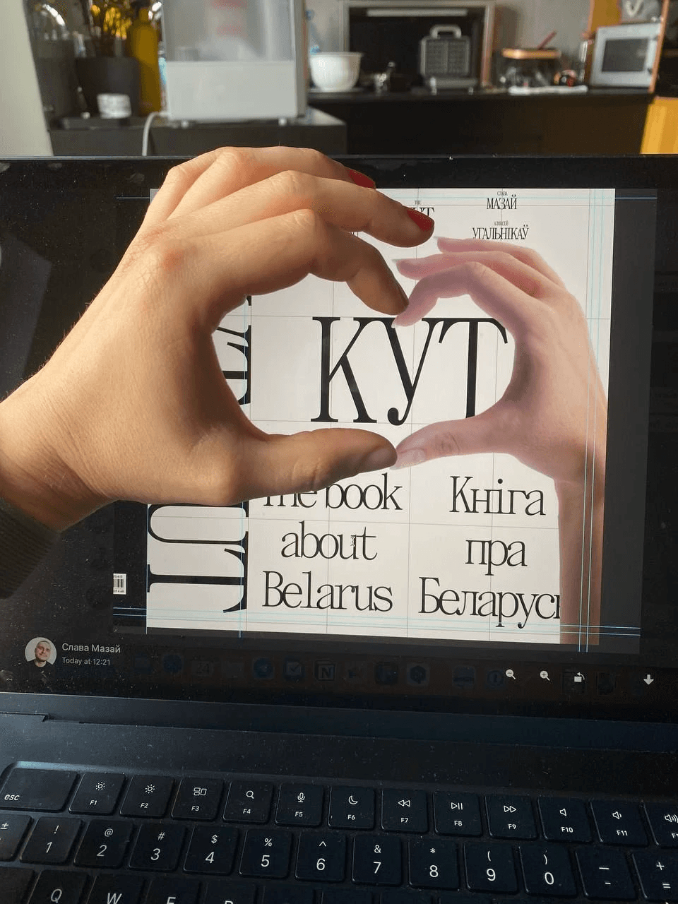 Here's a cover that almost made it to the final cut: making half a hand heart on the cover. The idea was that any person holding the book could put his other hand and get a whole heart. In the heart there would be an outline of Belarus and the inscription "KUT", so that you get "KUT in your heart".
