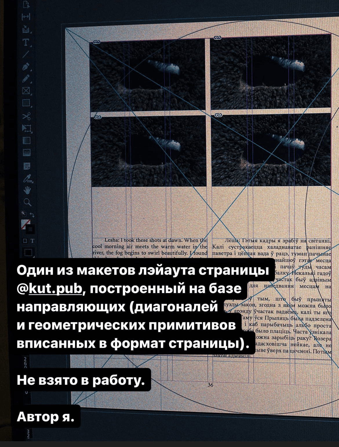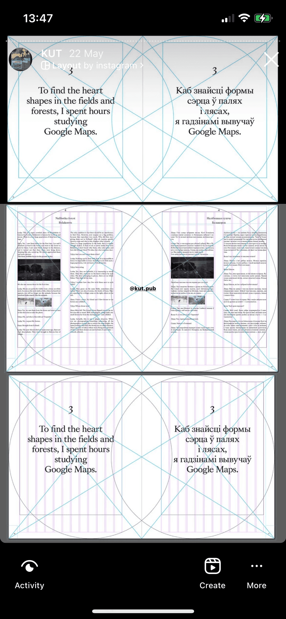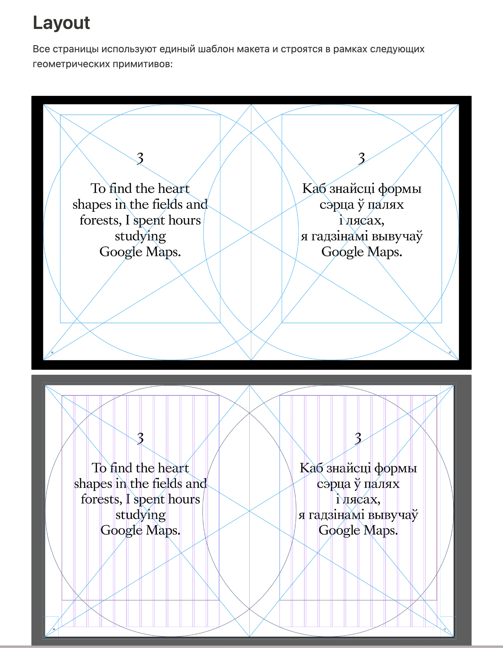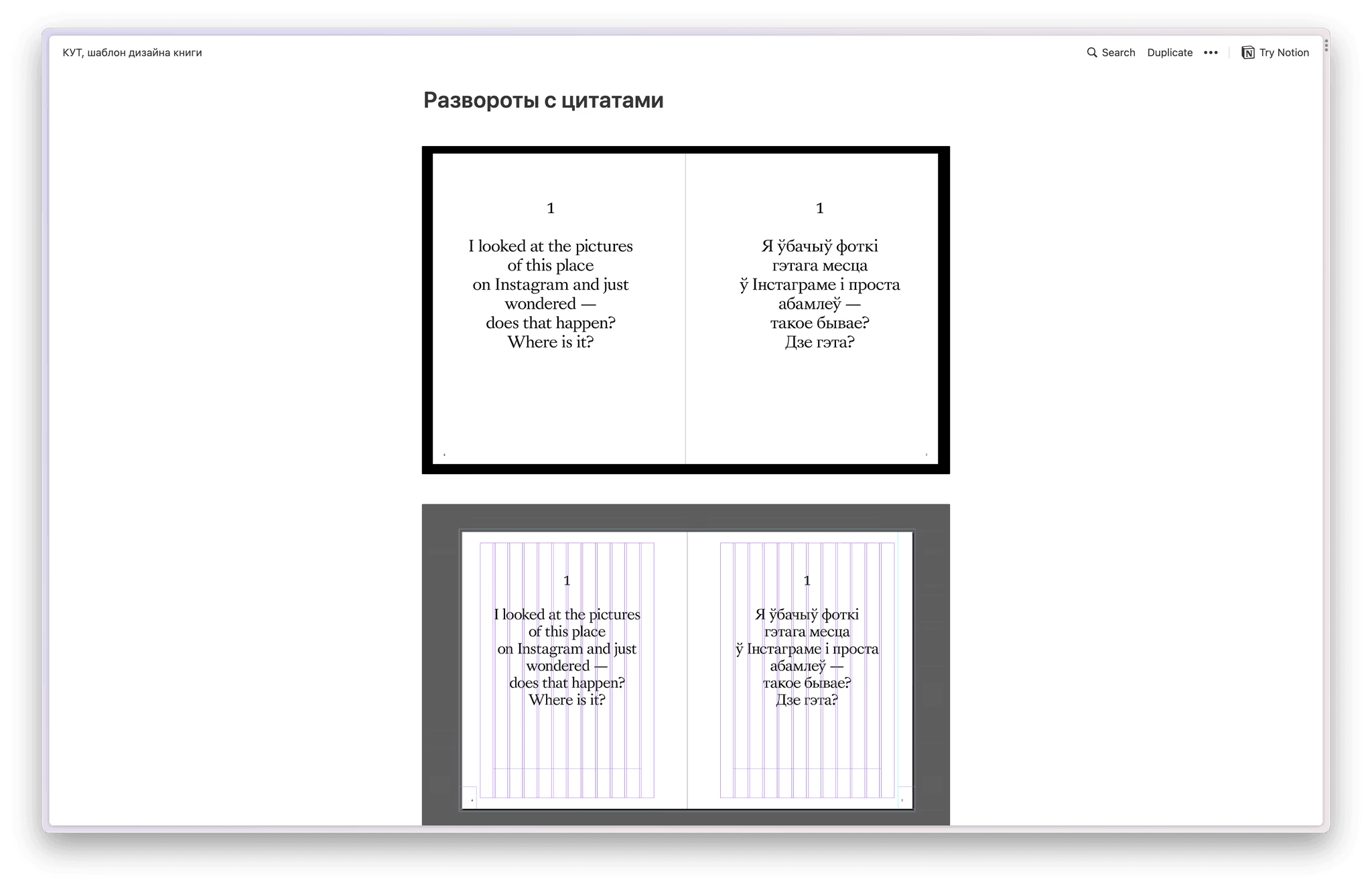 Once we had the book layout almost ready and were finalising details, Slava went to a regular printing centre and printed a few pages of the book on A3 sheets. We folded them in half to get smaller drafts of the future pages of the book. It's hard to say whether this helped us in any way, but we met several times just to lay these sheets out and look over them.
