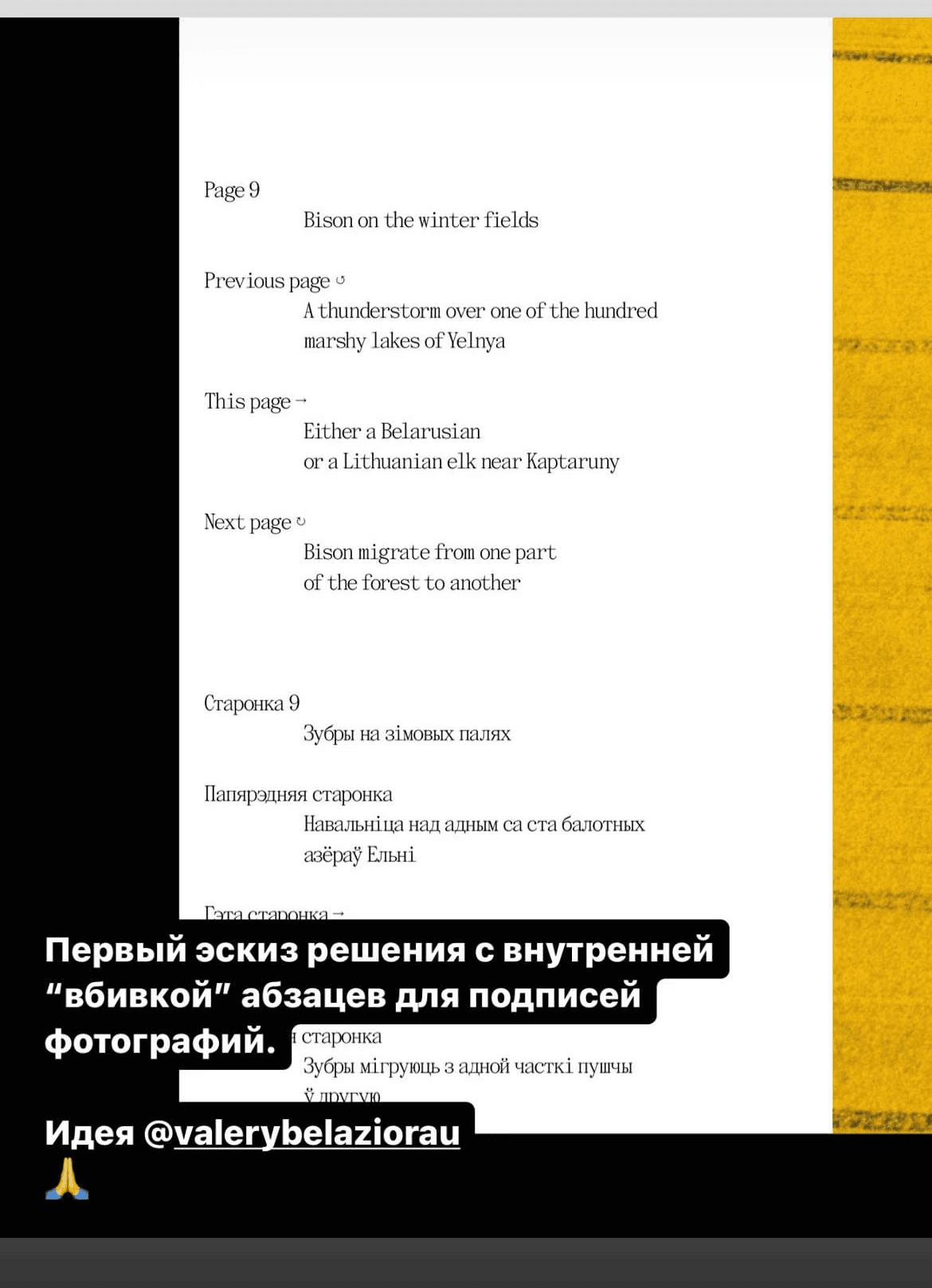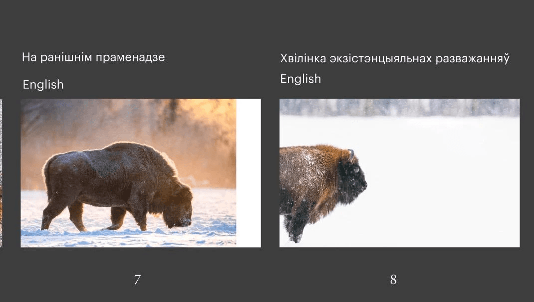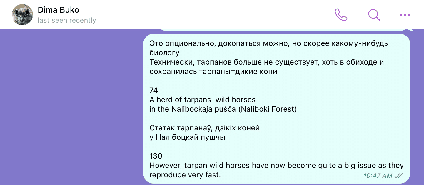 After the pilot version had already been printed, we started to make edits to the final layout. Or, as the proofreader used to say, "catching all the fleas". It took about five iterations so that both texts, Belarusian and English, were identical and sounded good in each language. The last thing that Olya asked me to correct in the final layout, which was at this point practically lying in the inbox of the printers, was the definition of “tarpans” (wild horses).