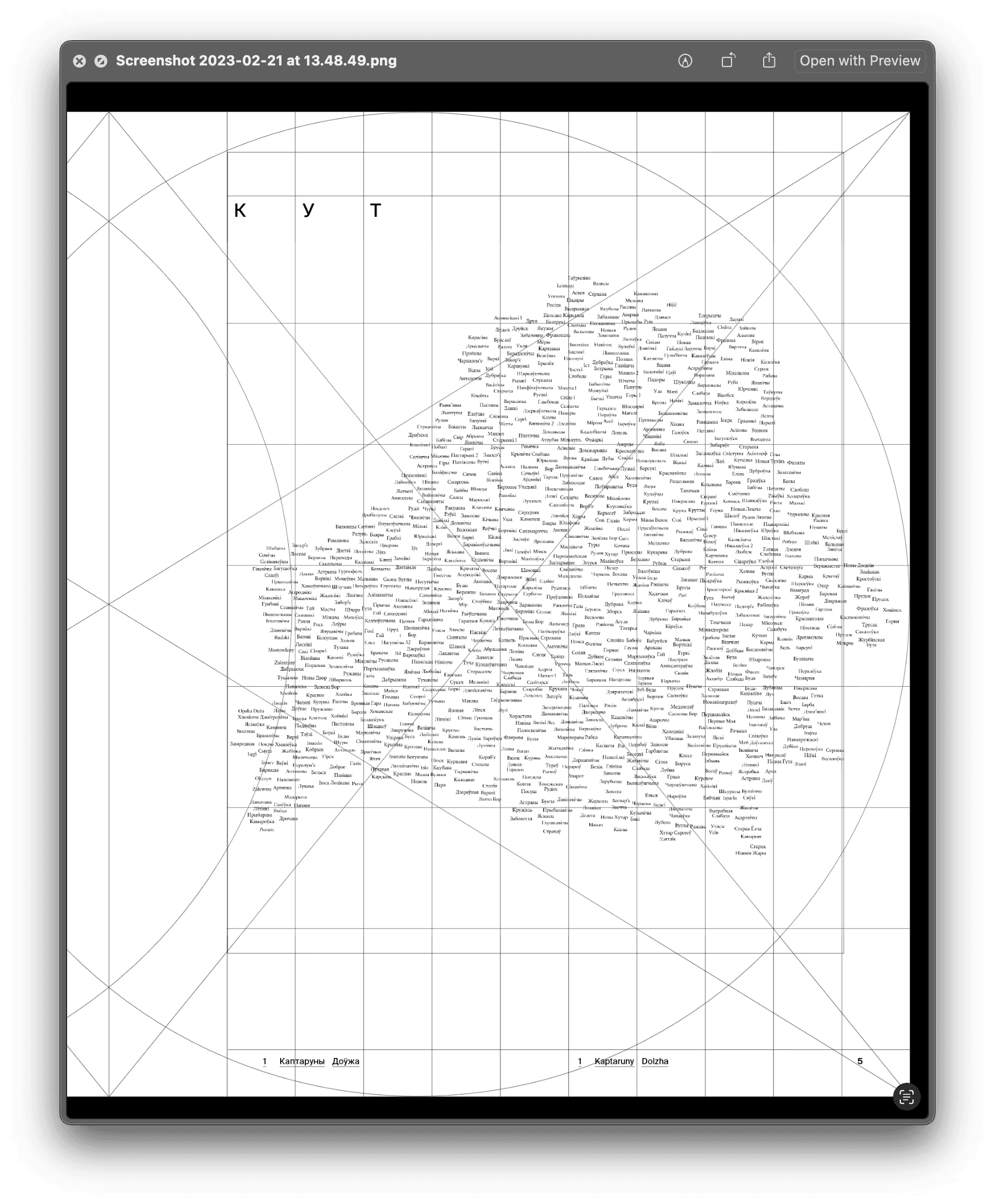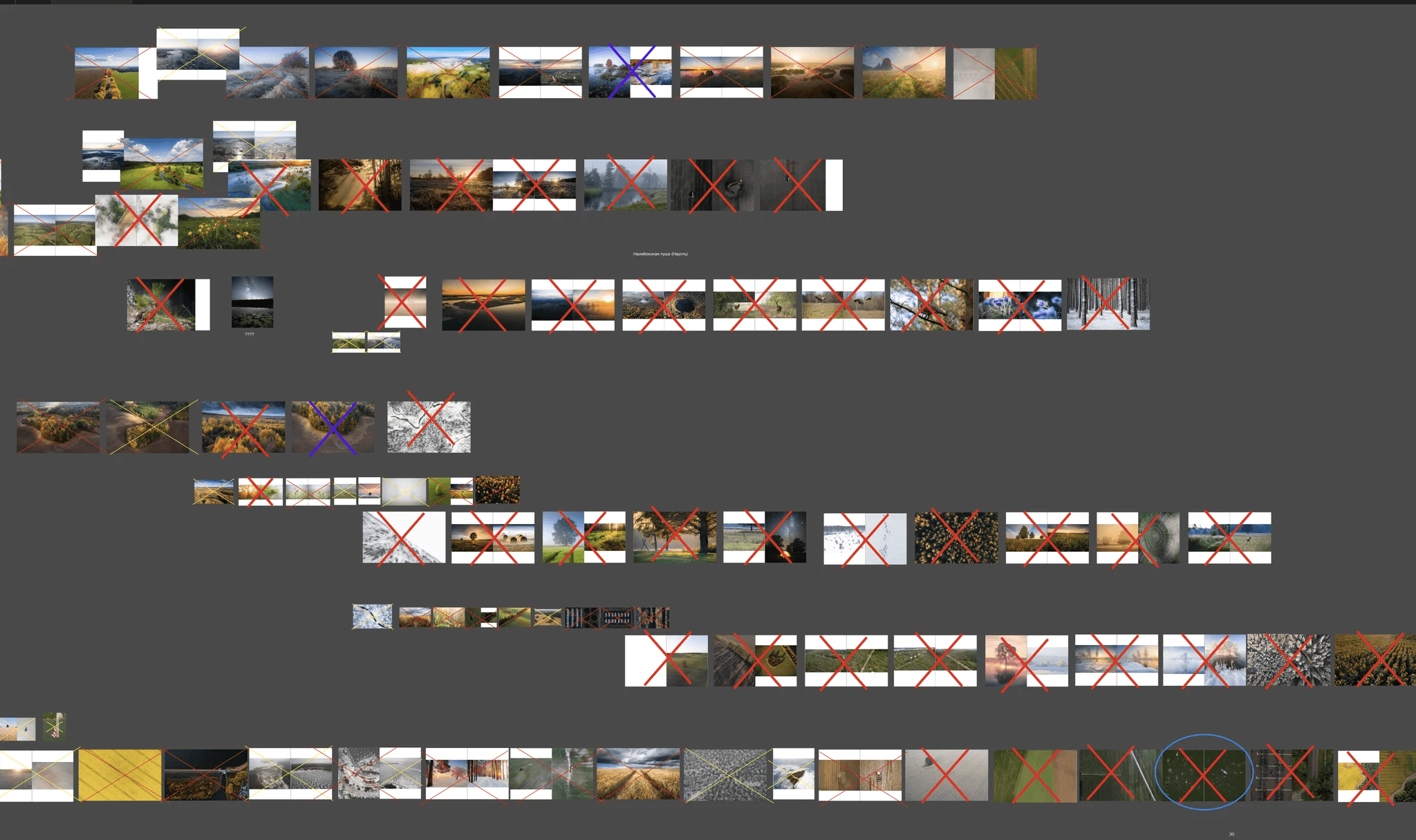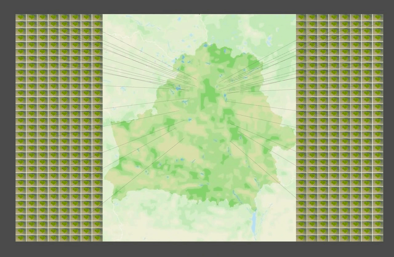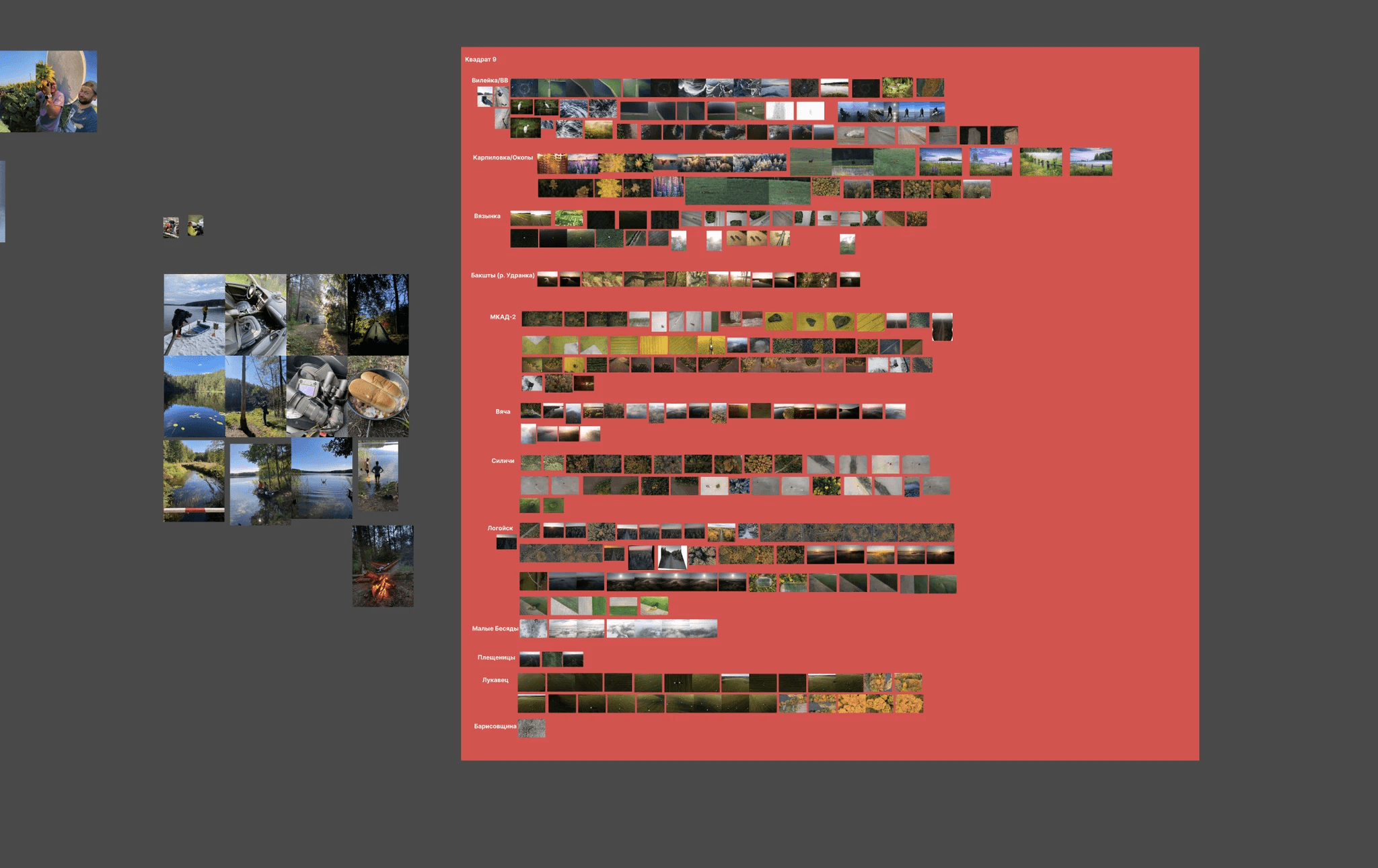 As we collected more and more photographs, it became clear that most of the photos were not related to any kind of settlement at all. More often than not, the photos were not taken in a village or a town but in a forest or some place near a river. The idea to use a coordinate grid raised. Funnily enough, the idea was first brought up while we were somewhere on the road and I drew it with children’s crayons right on the asphalt: