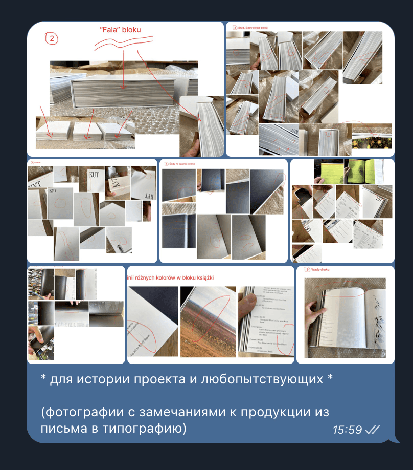 What Slava didn't like - most people wouldn't even notice. Inaccuracies in the cutting of the book block, small defects on the covers and pages where they were glued together. We took more than a hundred photos, I divided them into subgroups and sent the comments to the printer. I thought, or rather I was convinced, that they would say "Fuck you". But they promised to redo everything and correct it in the final printed version.