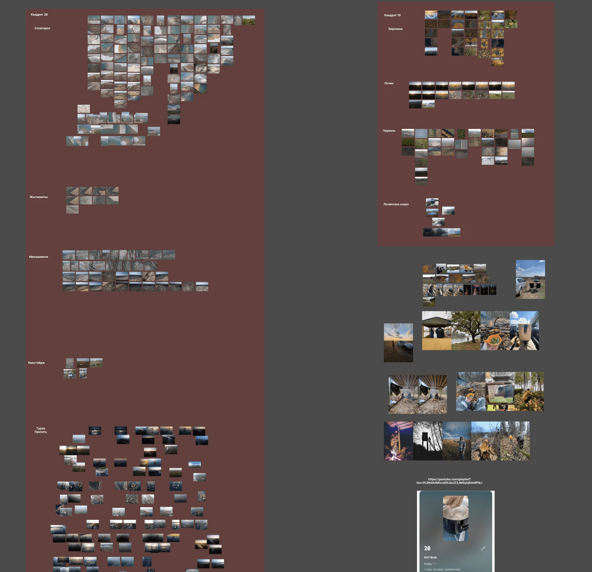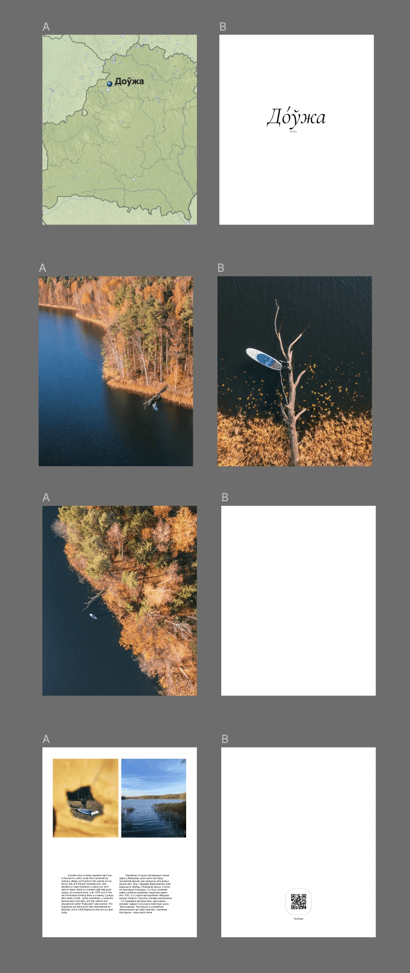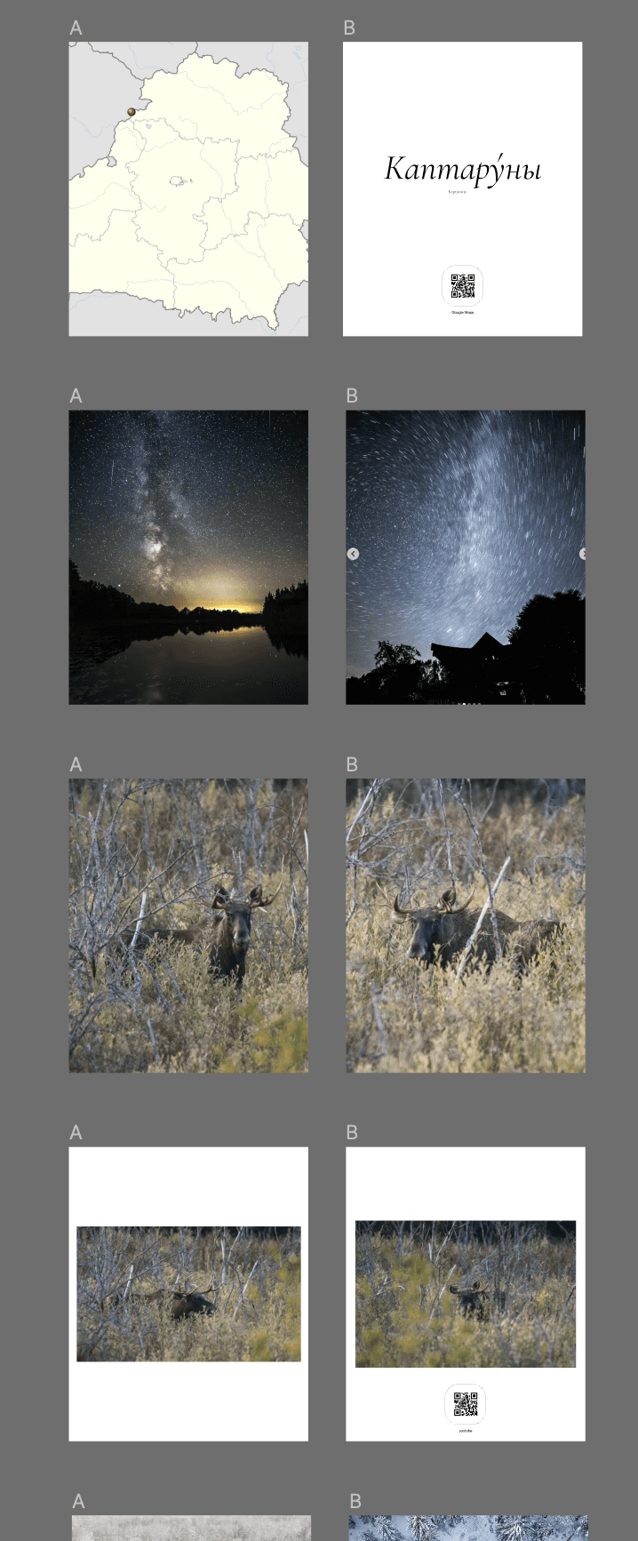 You can see QR-codes on these layouts. Initially, we thought that they would link to locations on Google Maps (for example, to the village of Kaptaruny) or to videos on YouTube (for example, to a video about how we photographed that moose).