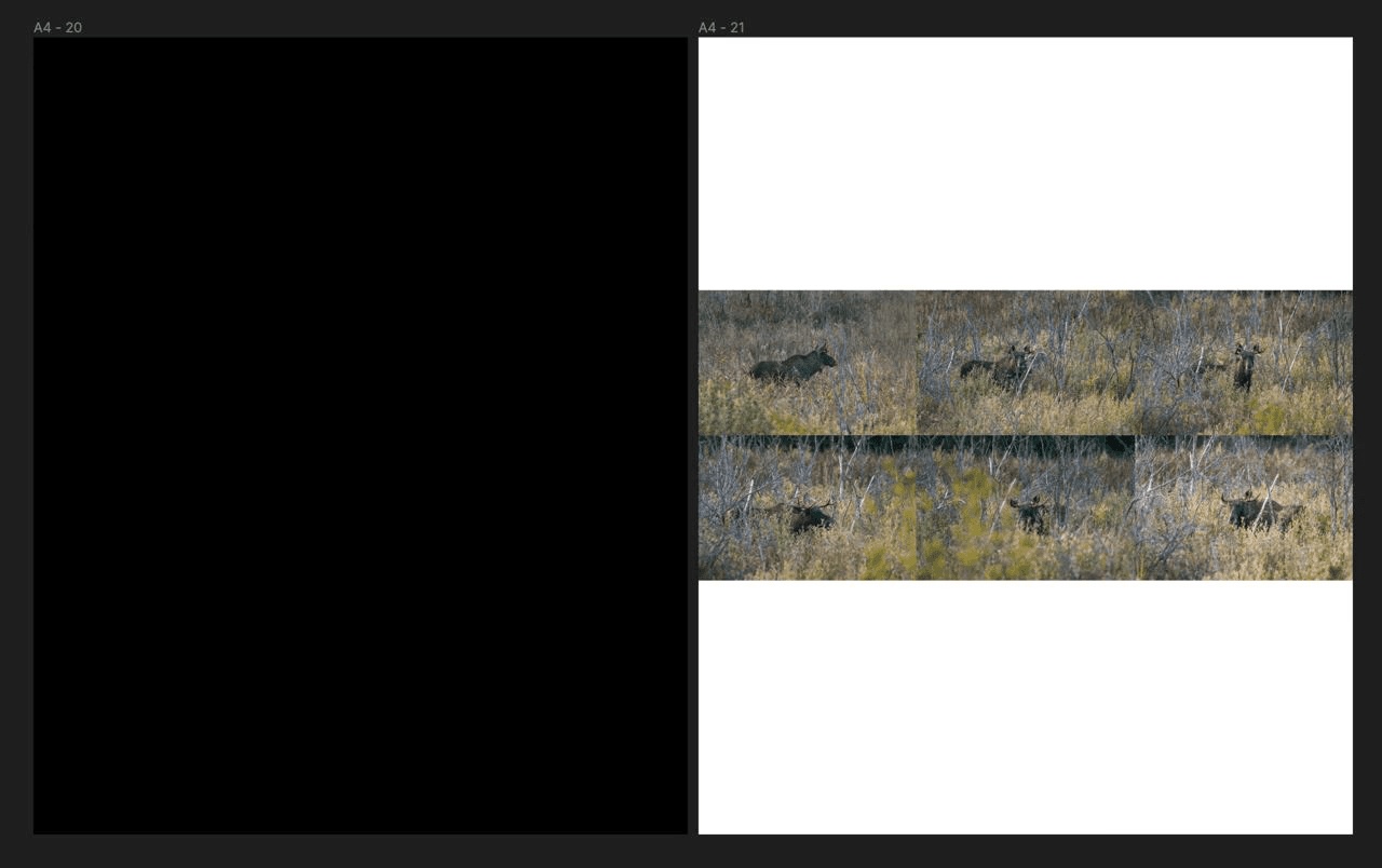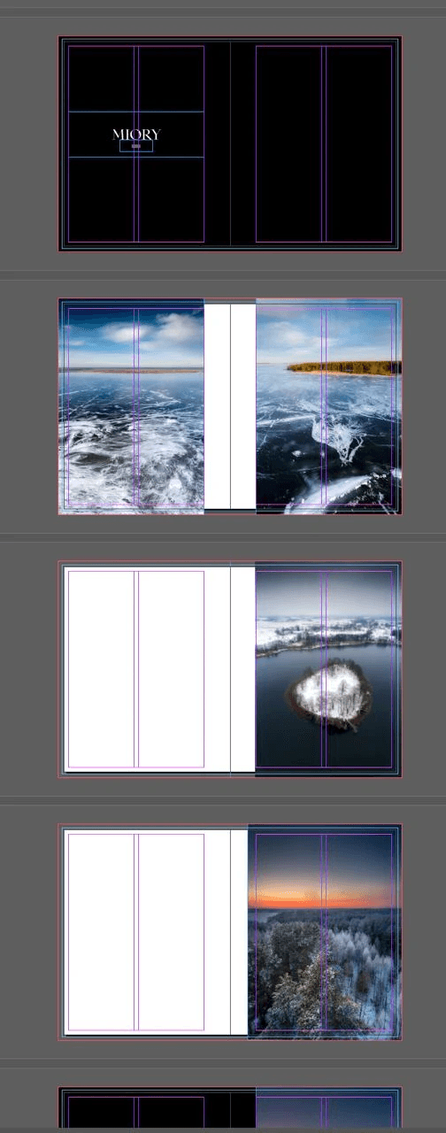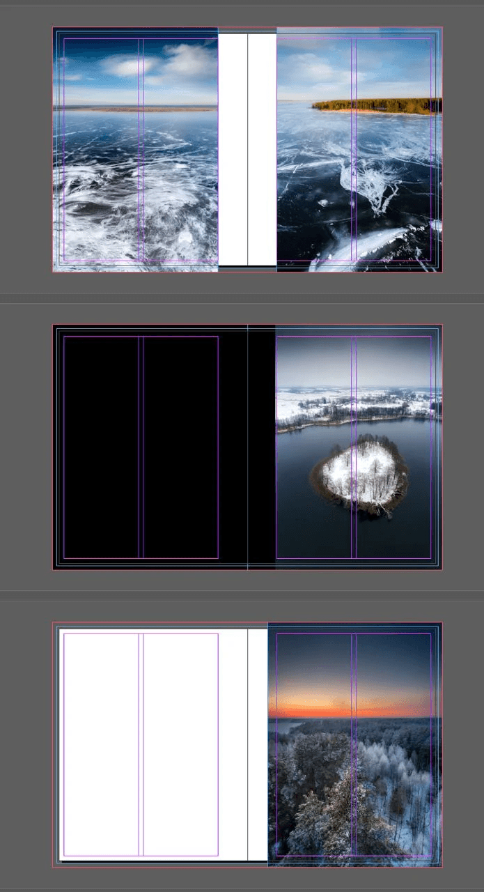 We created rough page layouts and potential book spreads and began adding photographs. We moved them around, trying to lock down ideas. Some of the first drafts looked like this: